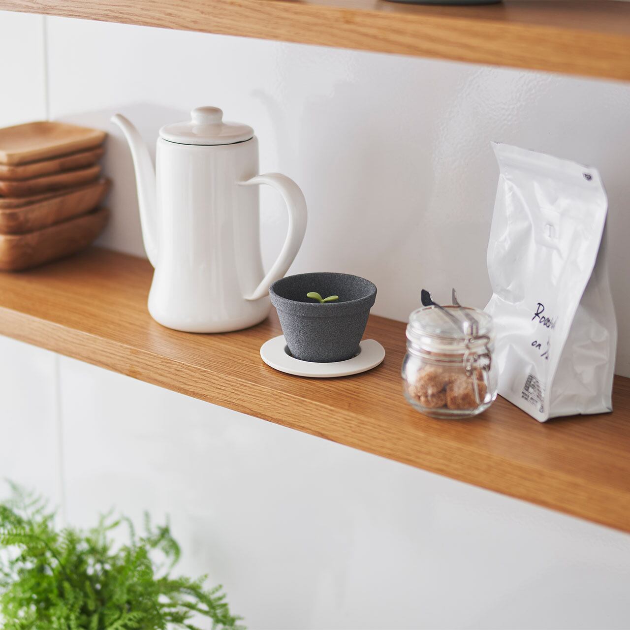 小さな芽に水をあげるように淹れる、セラミックコーヒーフィルターです。コーヒーを淹れるひとときを楽しむことで、豊かな時間も新芽のように育ちます。植木鉢のようなフィルターから生えている芽の目盛りは、適切なコーヒー豆と湯量の目安にも。1〜2人分を淹れられます。